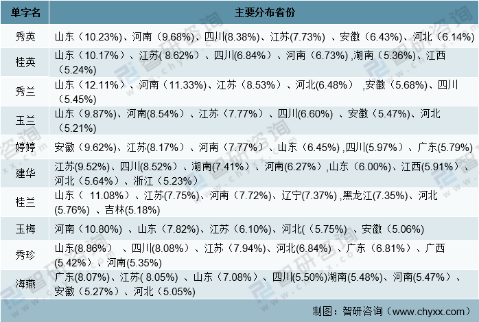 全國使用最多的10個雙字名相對集中分布在山東、河南、四川、江蘇、河北、湖南、安徽等省份。此外,還有5.24%的“桂英”分布在江西;5.79%的“婷婷”、6.81%的“秀珍”、8.07%的“海燕”分布在廣東;5.91%、5.23%的“建華”分布在江西和浙江;7.37%、7.35%、5.18%的“桂蘭”分布在遼寧、黑龍江和吉林;5.42%的“秀珍”分布在廣西。