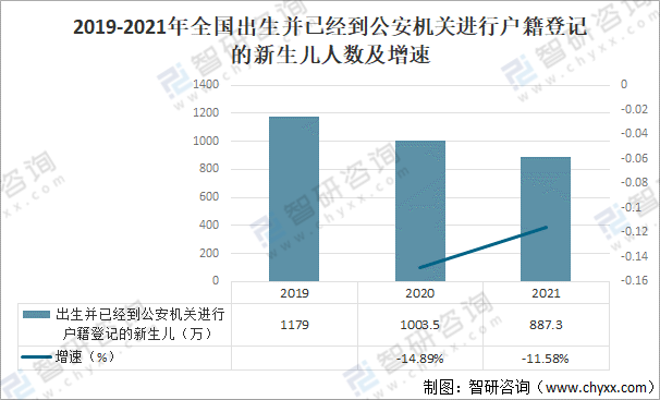 2019-2021年全國出生并已經到公安機關進行戶籍登記的新生兒人數及增速