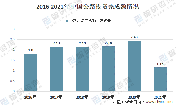 2020年中國公路投資完成額2.43萬億元,較2019年增和0.27萬億元,是2016年以來公路投資完成額最高的一年,截止2021年上半年,中國完成額1.15萬億元。