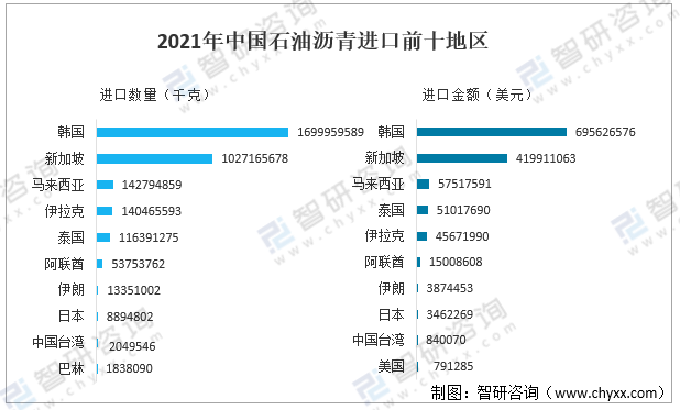 其中2021年中國石油瀝青主要進(jìn)口地區(qū)為韓國、新加坡及馬來西亞等,韓國地區(qū)進(jìn)口數(shù)量為1699959589千克,進(jìn)口金額為695626576美元。