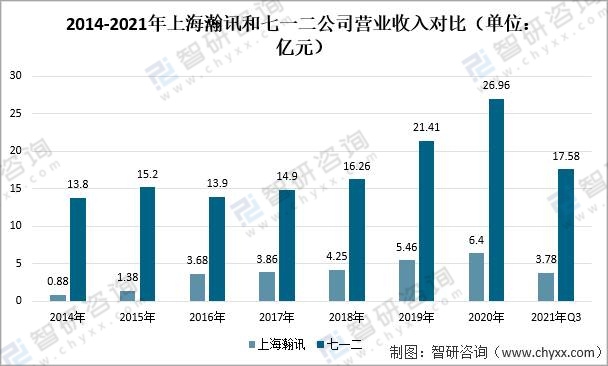 2014-2021年上海瀚訊和七一二公司營(yíng)業(yè)收入對(duì)比(單位:億元)