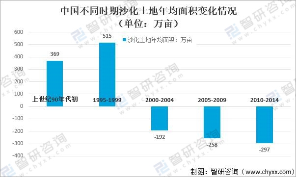 從中國不同時期沙化土地年均面積變化情況來看,上世紀90年代初,中國沙化土地年均面積369萬畝;1995-1999年,中國沙化土地年均面積515萬畝;2000-2004年,中國沙化土地年均面積-192萬畝;2005-2009年,中國沙化土地年均面積-258萬畝;2010-2014年,中國沙化土地年均面積-297萬畝。