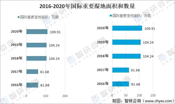 從國際重要濕地面積和數量來看,2020年國際重要濕地面積109.91萬畝,較2016年增長48.23萬畝;國際重要濕地數量64個,較2016年增長15個。