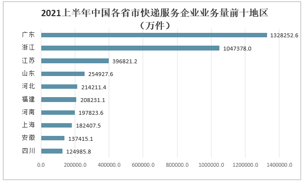 2021上半年中國各省市快遞服務企業(yè)業(yè)務量前十地區(qū)