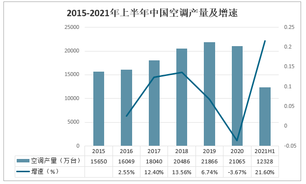 2015-2021年上半年中國空調產量及增速