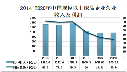 2014-2020年中國規模以上床品企業營業收入及利潤