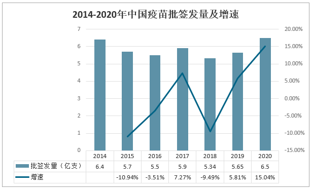 不同疫苗的生產時間各不相同,有的疫苗可能需要22個月才能生產出一個批次。疫苗的開發是一個漫長而復雜的過程,且成本很高。接種疫苗是預防和控制傳染病最經濟、有效的公共衛生干預措施,對于家庭來說也是減少成員疾病發生、減少醫療費用的有效手段。2020年中國疫苗批簽發量為6.5億支,同比增長15.04%。2014-2020年中國疫苗批簽發量及增速