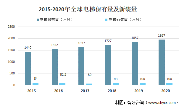 垂直升降電梯具有一個(gè)轎廂,運(yùn)行在至少兩列垂直的或傾斜角小于15°的剛性導(dǎo)軌之間。轎廂尺寸與結(jié)構(gòu)形式便于乘客出入或裝卸貨物。2020年全球電梯保有量約為1957萬(wàn)臺(tái),同比增長(zhǎng)5.4%;全球電梯新裝量為100萬(wàn)臺(tái)。