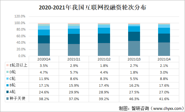 2021年第四季度,我國互聯(lián)網(wǎng)早期投資占比68.6%,環(huán)比下降5.2%,同比上漲5.8%;其中,種子天使投資占比41.6%,A輪投資占比27%,B輪投資占比17.6%,C輪投資占比8.8%,D輪投資占比3%,E輪及以上投資占比2.1%。