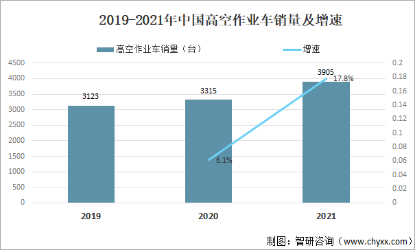 高空作業車是一種將作業人員、工具、材料等通過作業平臺舉升到空中指定位置進行各種安裝、維修等作業的專用高空作業機械,既屬于專用汽車,又屬于工程機械,是一種重要的施工設備。2021年中國高空作業車銷量為3905臺,同比增長17.8%。