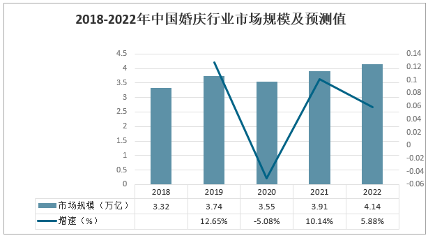 隨著居民收入的增加和生活品質的提高,婚慶質量要求逐年上升,形式趨于多樣化,形成了巨大的增量市場。數據顯示,由于疫情的影響,2020年的婚慶行業市場規模有小幅度下跌,但隨著國內疫情逐漸得到控制,婚慶市場將會重回增長態勢,預計2022年中國婚慶行業市場規模將突破4萬億元。