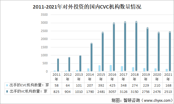 2011-2021年對外投資的國內CVC機構數量情況