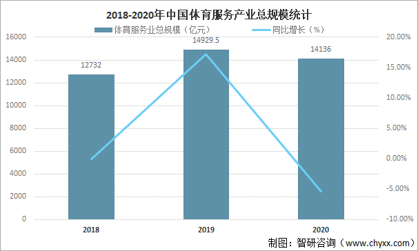 體育服務業既是服務業的重要組成部分,也是體育產業的核心,體育服務業發展水平已成為衡量經濟發展水平和體育產業成熟度的重要標志,近些年來,隨著我國人均可支配收入增加,大眾閑暇時間的增多和健康意識的增強,帶動了體育服務業中健身休閑、競賽表演、場館服務以及體育培訓等業態的快速發展,使體育服務業市場供給不斷改善,產品種類逐漸豐富,總產出穩步增加,2019年中國體育服務產業總規模達14929.5億元,較2018年增加了2197.5億元,同比增長17.26%,受新冠肺炎疫情居家隔離的影響,2020年中國體育服務產業總規模有所下滑,2020年中國體育服務產業總規模為14136億元,較2019年減少了793.50億元,同比減少5.31%。