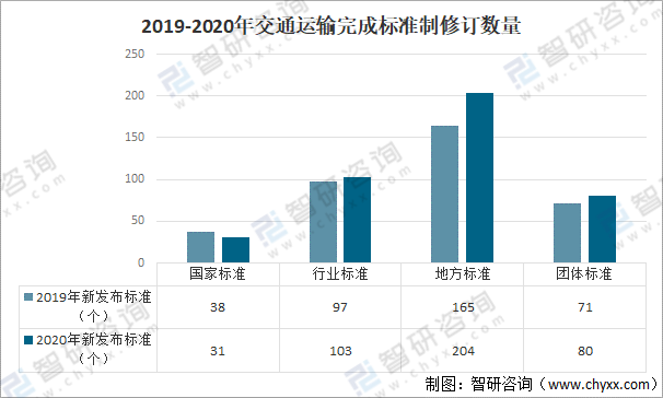 2020年,完成標(biāo)準(zhǔn)制修訂數(shù)量418項(xiàng),較上年增加47項(xiàng)。其中,國家標(biāo)準(zhǔn)31項(xiàng),較上年減少7項(xiàng);行業(yè)標(biāo)準(zhǔn)103項(xiàng),較上年增加6項(xiàng);地方標(biāo)準(zhǔn)204項(xiàng),較上年增加39項(xiàng);團(tuán)體標(biāo)準(zhǔn)80項(xiàng),較上年增加9項(xiàng)。2019-2020年交通運(yùn)輸完成標(biāo)準(zhǔn)制修訂數(shù)量