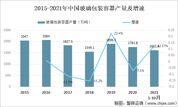 玻璃包裝容器是將熔融的玻璃料經吹制、模具成型制成的一種透明容器。玻璃包裝容器主要用于包裝液體、固體藥物及液體飲料類商品。2021年1-10月中國玻璃包裝容器產量為1612.8萬噸,同比增長12.57%。