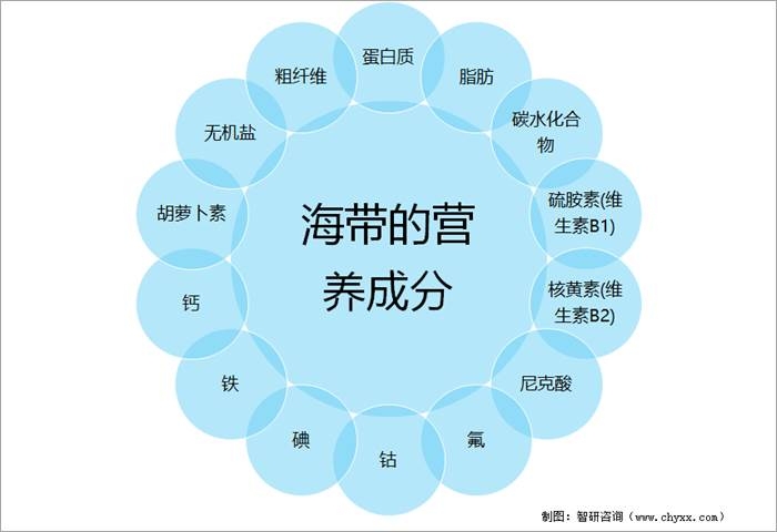 海帶成本低廉,營養豐富,是一種重要的海生資源。海帶作為現代生活中人們青睞的食品之一,也因其含有豐富的蛋白質、碳水化合物以及粗纖維等,它不但可以提供人們活動所需要的能量,其中含有的粗纖維還可以促進腸道蠕動,代替部分蔬菜水果的功效。不僅如此,海帶中還含有大量人體所需的金屬元素,如鈣、磷、鐵、鎂、硒、碘、鉀、鈷等,其中特別是碘含量相當的豐富,因此海帶可以為缺碘環境中的人們補充碘元素提供一個重要的途徑跟方式;另外,海帶中還含有大量的維生素、胡蘿卜素以及無機鹽等成分。海帶的營養成分
