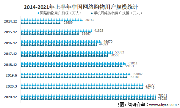 受疫情影響,2020年中國網絡購物用戶規模快速增長,截止2021年6月中國網絡購物用戶規模已達78241萬人,其中手機網絡購物用戶規模達78058萬人,龐大的用戶群體為中國網絡購物行業的發展提供了扎實的基礎。2014-2021年上半年中國網絡購物用戶規模統計