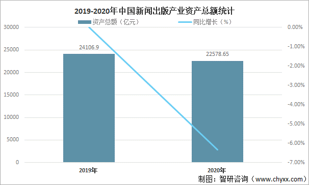 2020年受新冠肺炎疫情等因素嚴(yán)重沖擊,新聞出版產(chǎn)業(yè)規(guī)模有所下滑,但發(fā)展基本面仍保持穩(wěn)定,2020年中國(guó)新聞出版產(chǎn)業(yè)資產(chǎn)總額為22578.65億元,較2019年減少了1528.25億元,同比減少6.34%。