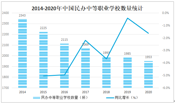 民辦中等職業教育是我國教育重要的組成部分,但自2015年起中國民辦中等職業學校數量逐年減少,2020年中國共有1953所民辦中等職業學校,較2019年減少了32所,同比減少1.6%。