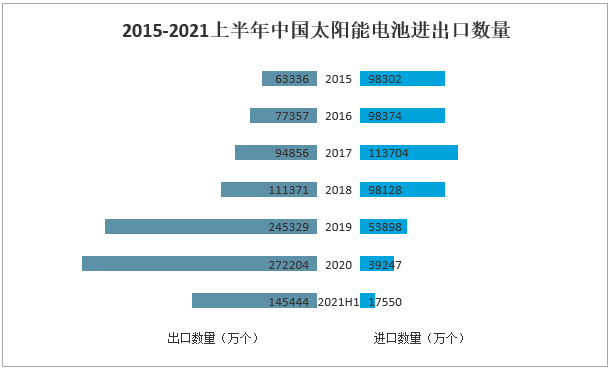 隨著近幾年來光伏產業的迅速發展,有機太陽能電池因其成本低、重量輕、易于成批次生產、制作工藝簡單和可制備成柔性器件等優點。2021上半年中國太陽能電池出口數量為145444萬個;進口數量為17550萬個。