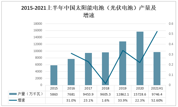 太陽能電池,是一種利用太陽光直接發電的光電半導體薄片,又稱為“太陽能芯片”或“光電池”,它只要被滿足一定照度條件的光照度,瞬間就可輸出電壓及在有回路的情況下產生電流。2021上半年中國太陽能電池(光伏電池)產量為9746.4萬千瓦,同比增長52.6%。2015-2021上半年中國太陽能電池(光伏電池)產量及增速