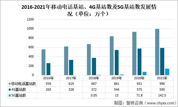 2021年,全國移動通信基站總數達996萬個,全年凈增65萬個。其中4G基站達590萬個,5G基站為142.5萬個,全年新建5G基站超65萬個。
