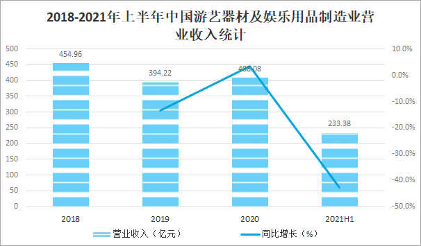2018-2021年上半年中國游藝器材及娛樂用品制造業營業收入統計
