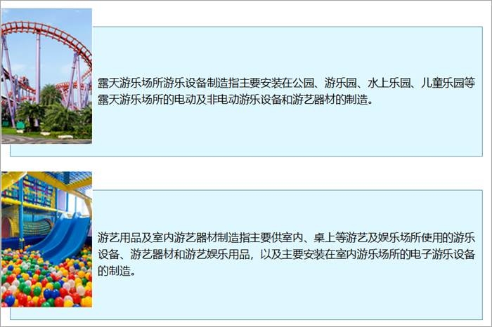 游藝器材及娛樂用品制造業主要包括露天游樂場所游樂設備制造和游藝用品及室內游藝器材制造等。露天游樂場所游樂設備制造指主要安裝在公園、游樂園、水上樂園、兒童樂園等露天游樂場所的電動及非電動游樂設備和游藝器材的制造。游藝用品及室內游藝器材制造指主要供室內、桌上等游藝及娛樂場所使用的游樂設備、游藝器材和游藝娛樂用品,以及主要安裝在室內游樂場所的電子游樂設備的制造。