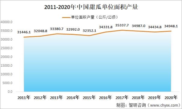 隨著現代農業的發展,農業專家在栽培方式、種植模式等方面不斷創新和實踐,我國甜瓜單產水平日益提高,單位面積產量由2011年的31446.1公斤/公頃增加至2020年的34948.1公斤/公頃,期間增加了3502.0公斤/公頃。