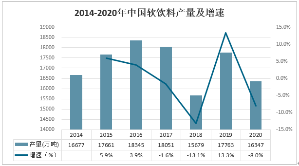 2019年中國軟飲料產(chǎn)量為17763萬噸,同比增長13.3%;2020年受疫情影響,加上人們生活水平提高,軟飲料產(chǎn)量16347萬噸,同比下降8%。
