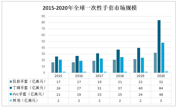 按銷售額來(lái)看,全球一次性手套市場(chǎng)由2015年的66億美元穩(wěn)步增長(zhǎng)至2019年的87億美元,年復(fù)合增長(zhǎng)率為7.3%。2020年全球PVC手套市場(chǎng)規(guī)模約為48億美元,同比增長(zhǎng)100%;全球丁晴手套市場(chǎng)規(guī)模約為84億美元,同比增長(zhǎng)110%。