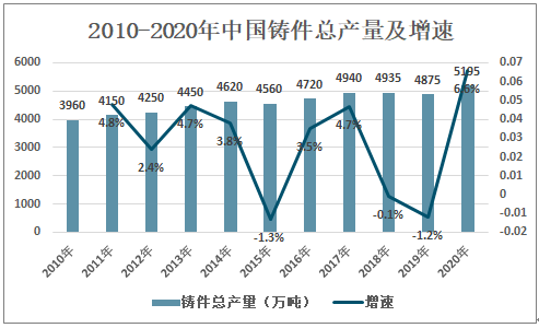 2020年受下游汽車降幅放緩,工程機械強勁的增長勢頭及風電等電力設備快速發展等因素影響,中國鑄件行業產量有所上升,達到2010年以來新高。2020年中國鑄件產量為5195萬噸,較2019年的4875萬噸同比增長6.6%。2010-2020年中國鑄件總產量及增速