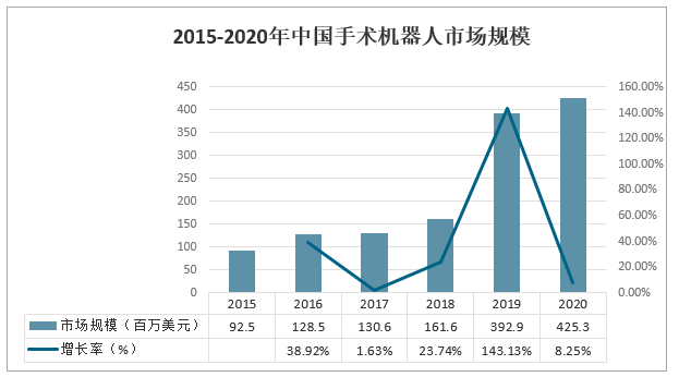 手術機器人的產業發展是得到國家支持的重要方向,2015~2020年,中國手術機器人市場規模從0.92億美元增加到4.25億美元(約27.6億元),年復合增長率為35.7%。 2020年中國手術機器人市場規模占全球市場份額為5.1%。
