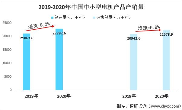 行業(yè)產(chǎn)銷呈恢復性增長態(tài)勢,產(chǎn)銷趨穩(wěn);2020年年初受疫情影響,一季度產(chǎn)量降幅超8%,隨著后續(xù)疫情得到有效控制,上半年逐步恢復同比基本持平,2020年全年中國中小型電機總產(chǎn)量為22782.6萬千瓦,同比增長8.2%。銷售為22378.9萬千瓦,同比增長6.9%。