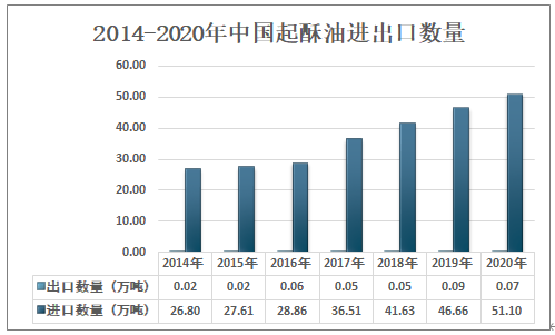 2020年中國起酥油出口數量為0.07萬噸,較2019年減少了0.02萬噸;進口數量為51.10萬噸,較2019年增加了4.44萬噸。
