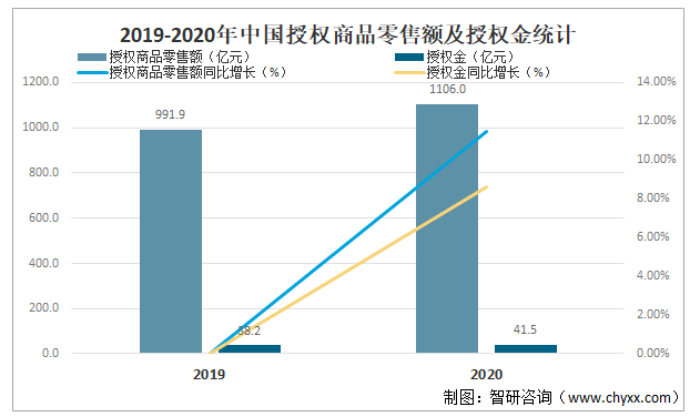品牌授權的原因在于一個強大的品牌能夠讓消費者產生清晰的識別并喚起消費者的品牌聯想,進而促進消費者對其產品需求。為了利用這種價值,一個品牌擁有者授權他的名稱、標識或者其他關于它的品牌的特征給另一企業,用在它的產品或服務上。通過這種方式,為品牌授權商和授權商品制造商提供了機會和利益。據調查統計,2020年中國年度授權商品零售額為1106億元,同比增長11.5%。2020年中國年度授權金為41.5億元,同比增長8.6%。