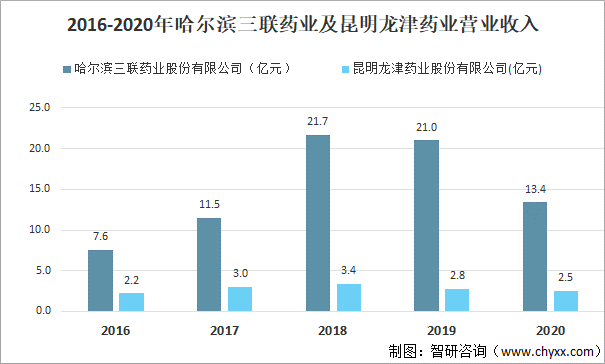 2020年哈爾濱三聯(lián)藥業(yè)股份有限公司營業(yè)總收入為13.4億元,同比下降36.3%;昆明龍津藥業(yè)股份有限公司營業(yè)總收入為2.5億元,同比下降7.7%。