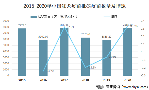 2015-2020年中國狂犬疫苗批簽疫苗數(shù)量及增速
