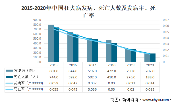 狂犬病的典型臨床表現(xiàn)為恐水癥,故狂犬病又稱恐水病,初期對聲、光、風等刺激敏感而喉部有發(fā)緊感,進入興奮期可表現(xiàn)為極度恐怖、恐水、怕風、發(fā)作性咽肌痙攣、呼吸困難等,最后痙攣發(fā)作停止而出現(xiàn)各種癱瘓,可迅速因呼吸和循環(huán)衰竭而死亡。人狂犬病主要通過患病動物咬傷、抓傷或由粘膜感染引起,在特定的條件下還可通過呼吸道氣溶膠傳染。受染動物唾液內(nèi)含狂犬病毒。傳染動物主要是犬(超過90%),其次是貓。2020年中國狂犬發(fā)病數(shù)量為202例,同比下降30.3%;狂犬病死亡人數(shù)量為188人,同比下降31.9%。2015-2020年中國狂犬病發(fā)病、死亡人數(shù)及發(fā)病率、死亡率