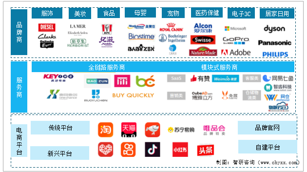 電商服務商為經營電子商務的個人和企業提供各種商業服務的個人和企業。包括:工具軟件類服務、網點托管類服務、咨詢類服務、營銷類服務等。中國品牌電商服務商產業圖譜有品牌商、服務商及電商平臺。中國品牌電商服務商產業圖譜