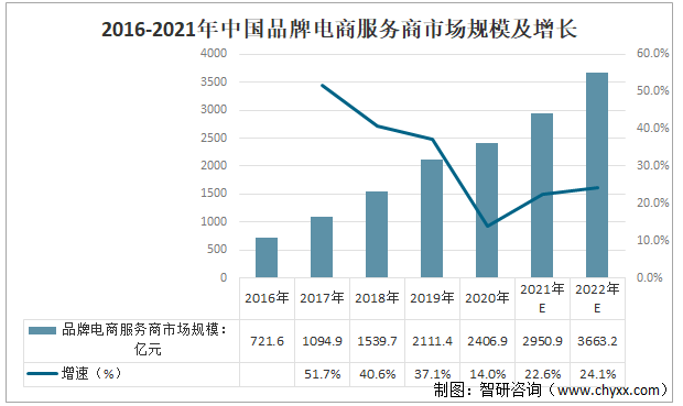 隨著中國互聯網行業的快速發展,中國品牌電商服務商市場規模保持較快增長速度,2020年中國品牌電商服務商市場規模2406.9億元,同比增14.0%,2021年中國品牌電商服務商市場規模估計可以達到2950.9億元,同比增長22.6%,未來品牌電商服務商整體市場規模也有望繼續擴大。