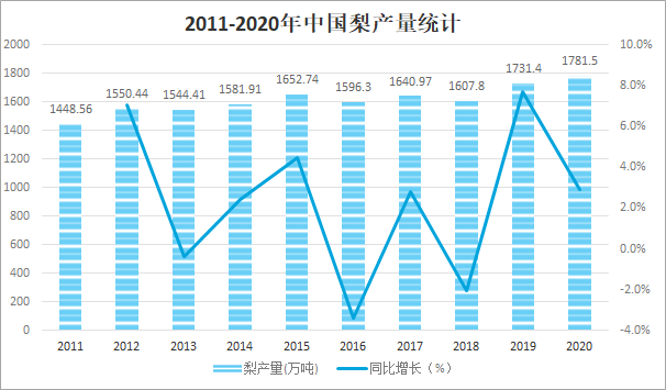 隨著栽培技術的不斷提升,中國梨產量快速增長,2020年中國梨產量達1781.5萬噸,較2019年增加了50.10萬噸,同比增長2.9%。