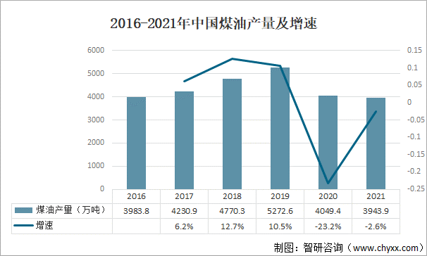 2016-2021年中國煤油產量及增速