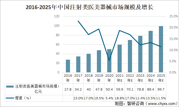 在"輕醫美"項目受歡迎程度不斷提高助推注射類醫美項目行業更快速發展,2020年中國注射類醫美器械市場規模達到50.4億元,預計2025年注射類醫美器械市場規模將達到97億元,注射類醫美器械市場規模占醫美器械的比重也將逐漸增長,預計2025年中國注射類醫美器械市場規模占醫美器械的比重增長至65.03%。