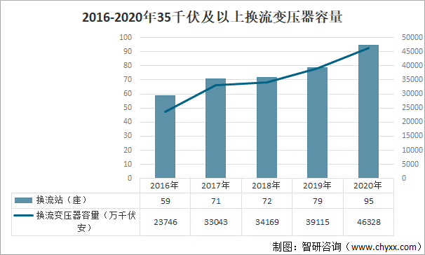 根據中國電力企業聯合會數據:2020年中國共有95座換流站,較2016年增加了36座;35千伏及以上換流變壓器容量達46328萬千伏安,較2016年增加了22582萬千伏安。