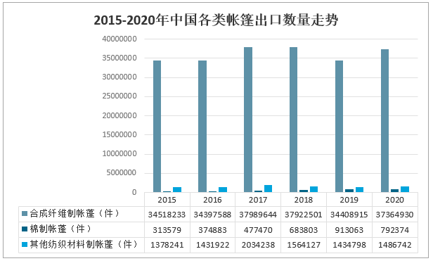 據中國海關數據,2020年中國合成纖維帳篷出口數量為37364930件,同比增長8.6%;棉制帳篷出口數量為792374件,同比下降13.2%;其他紡織材料制帳篷出口數量為1486742件,同比增長3.6%。