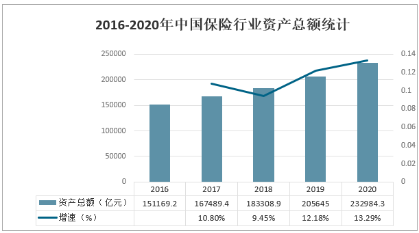 隨著人們生活水平的逐漸提高,保險意識的增強,近年來中國保險行業飛速發展,保險業成為中國增長最快的產業之一,2020年中國保險行業資產總額達232984.3億元,較2019年增加了27339.3億元,同比增長14.84%。