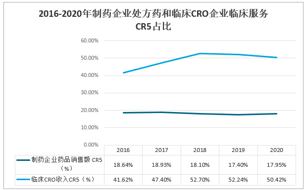 2016-2020年制藥企業處方藥和臨床CRO企業臨床服務CR5占比
