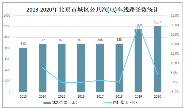 近年來北京市城區公共汽(電)車線路條數快速增加,尤其自2019年起增幅最為明顯,2020年北京市城區公共汽(電)車線路條數達1207條,較2019年增加了49條,同比增長4.2%。