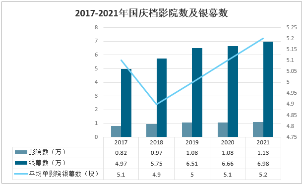 受疫情影響,近兩年影院建設持續放緩。2021年,國慶檔放映影院數量1.13萬,較上年增加0.05萬,同比增長4.6%;銀幕數量6.98萬塊,較上年增加0.32萬,同比增長4.8%;平均單影院銀幕數5.2塊,中型多廳影院建設仍主導影院增長。